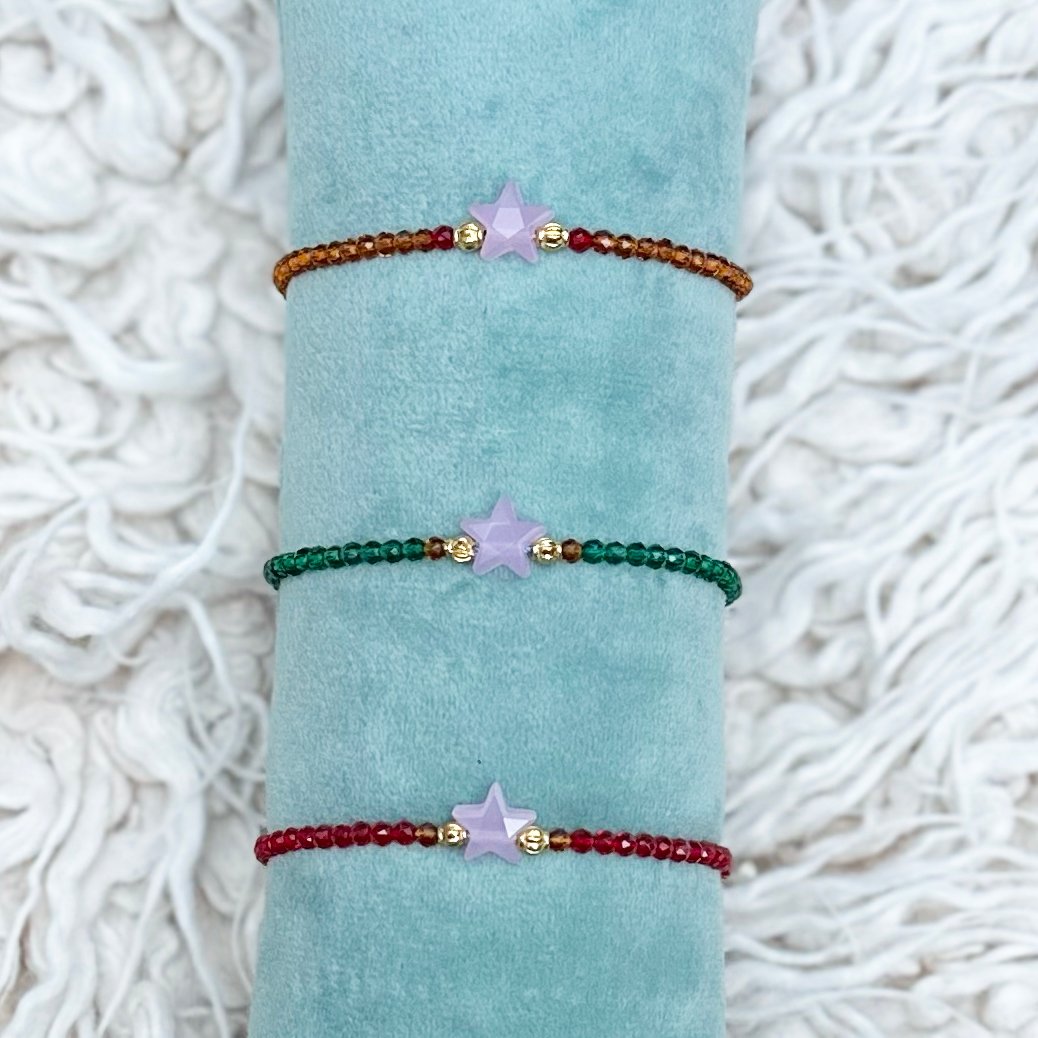Fijne armbandjes die op elke pols passen (achteraan aansnoerbaar), in 3 tinten facetpareltjes cognac, groen en rood.