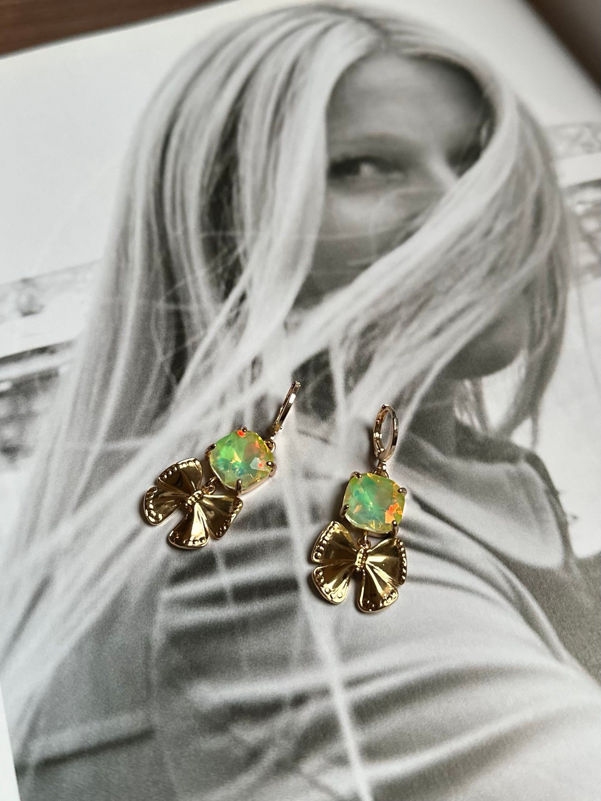 Creolen met holografisch geel-groenig gefacetteerde steen ; daaronder een mooie strik in goudkleurige afwerking. Lengte circa 4cm.