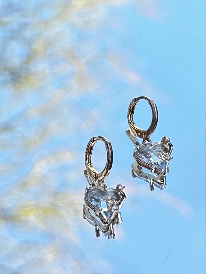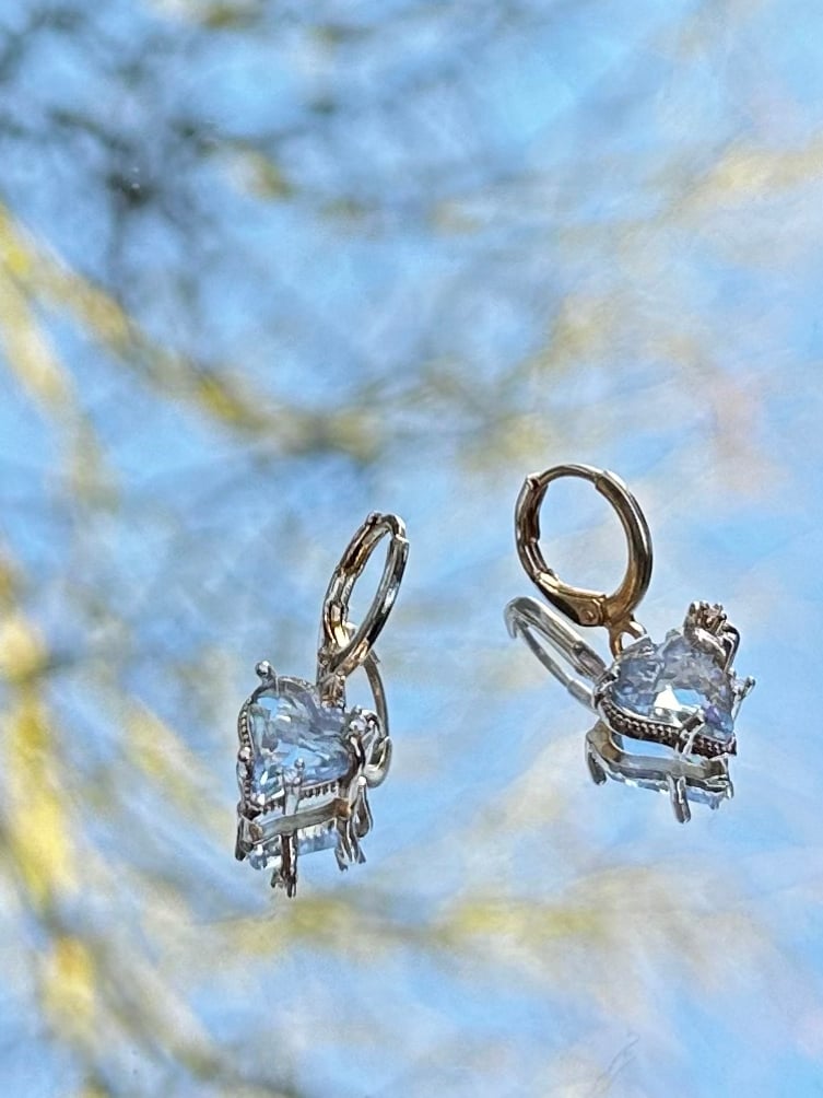 De hartvormige kristallen steentjes zijn helder blauw afgewerkt en hebben mini zirkonia steentjes aan de randjes, asymmetrisch in het kastje ingelegd.
