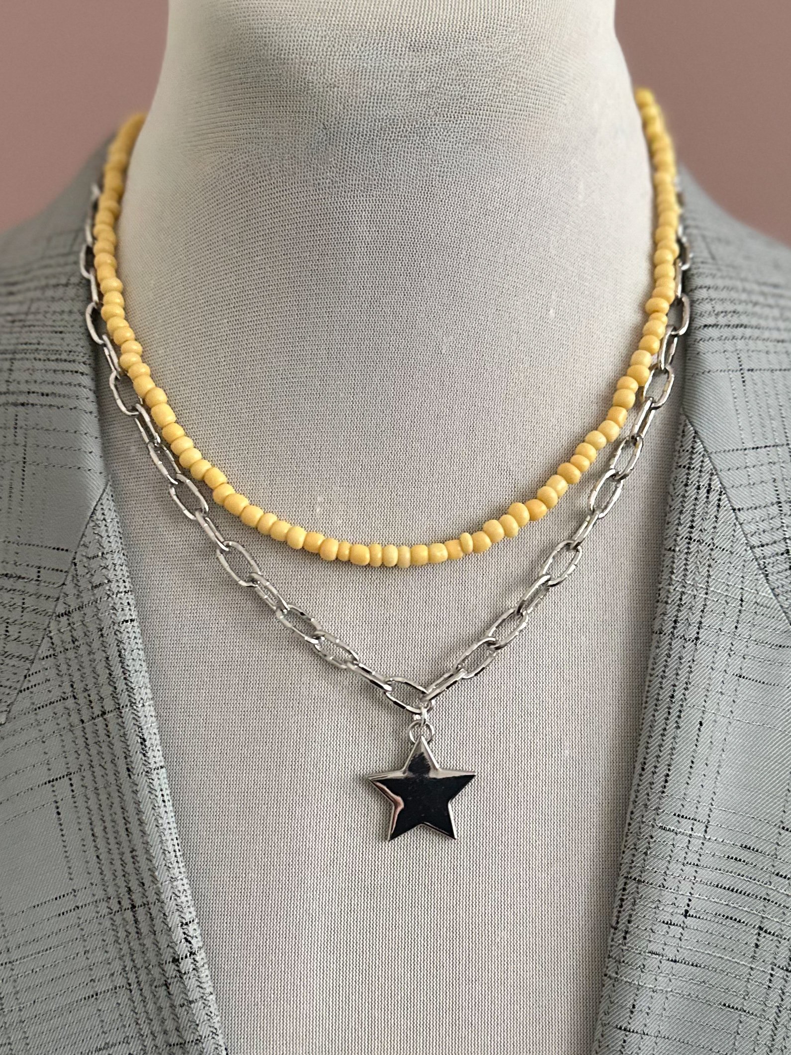 Dubbele halsketting die zowel in 1 als apart gedragen kan worden : enerzijds eentje met rocailles in warme botertint en anderzijds zilverkleurige schakelketting met vooraan een glanzend zilveren sterbedel. Door de 2 kettingen te verbinden met de schakel achteraan, blijven deze netjes op zijn plaats zitten.