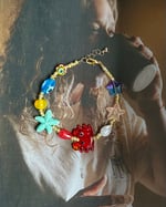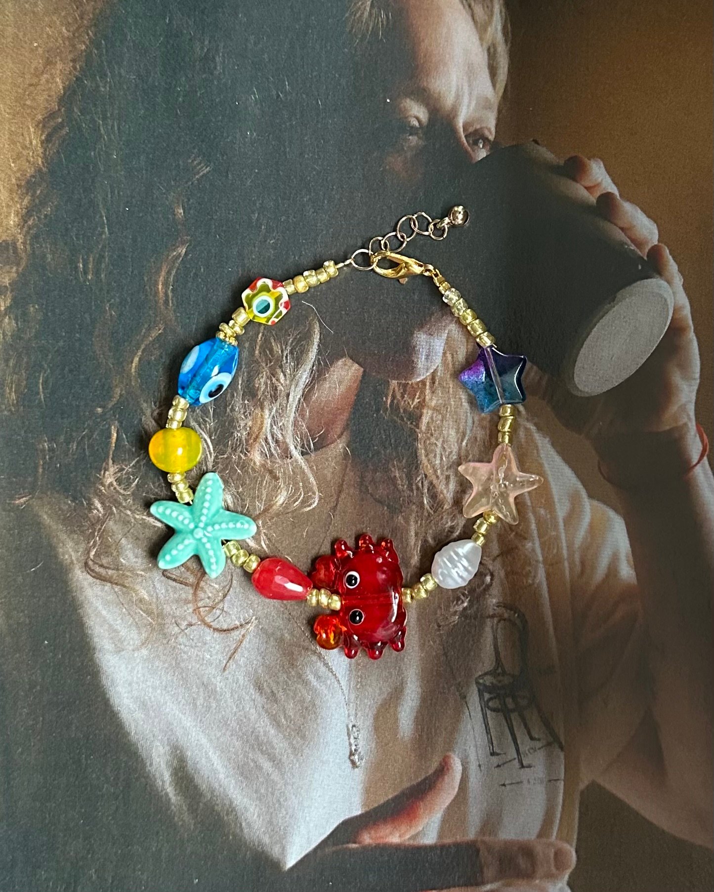 Elk armbandje is uniek qua parels en kleur maar het rode krabje staat centraal.