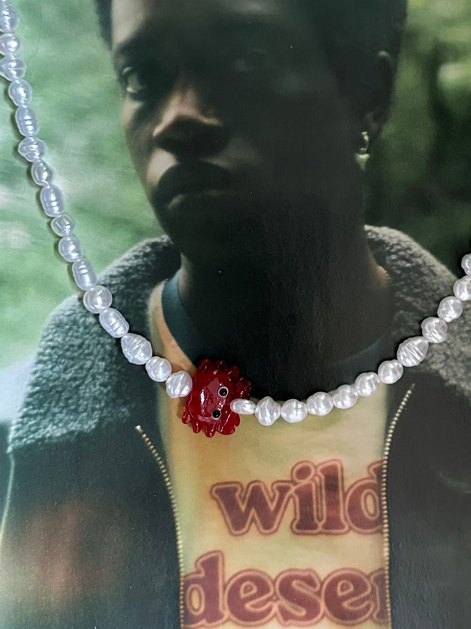 Parelketting met glasgeblazen krabje ; karabijnslotje achteraan. De ketting is ongeveer 40 cm lang maar indien je wenst, kan er een extra verlengstukje aan.