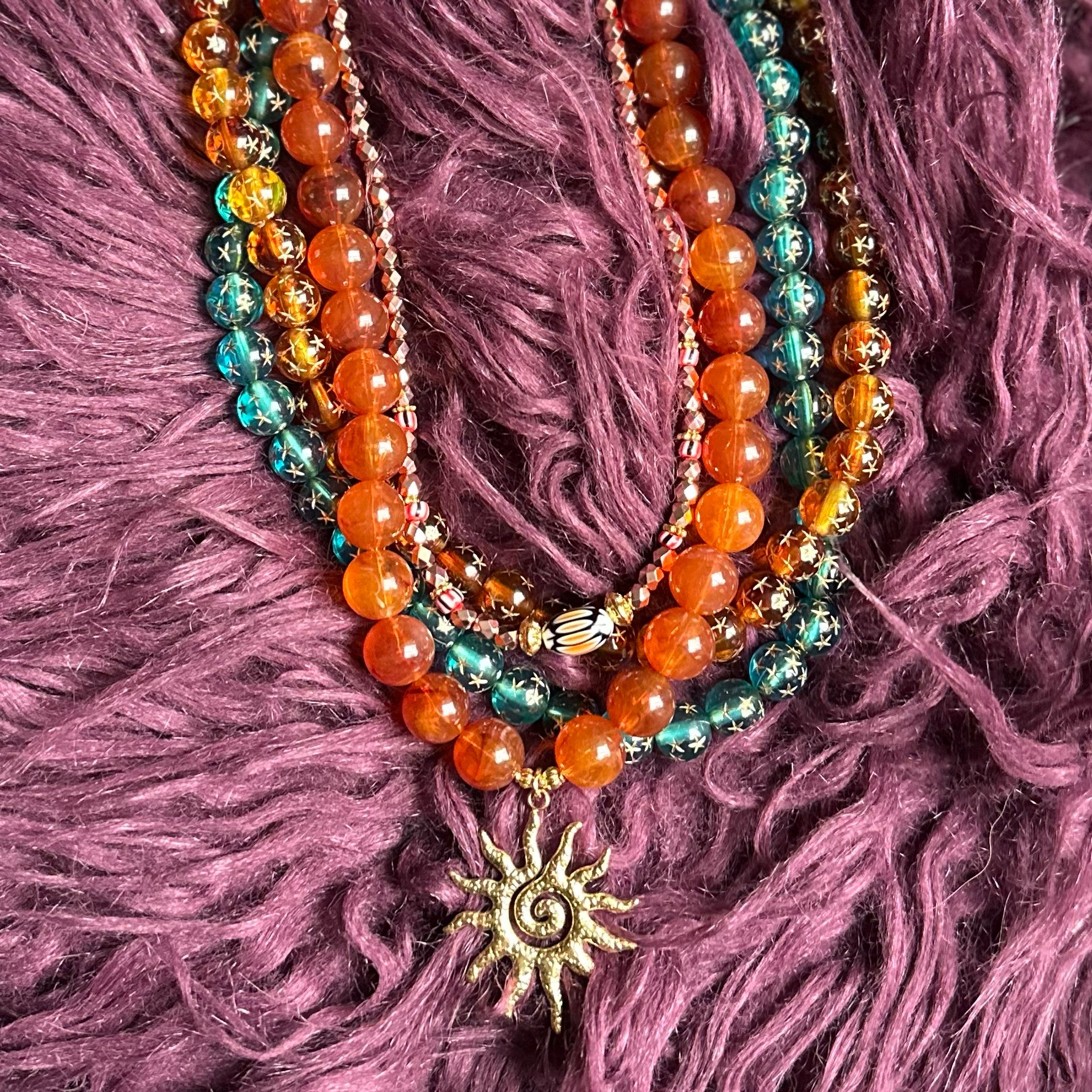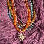 Volle chunly parels in warm cognacbruin, met vooraan een zonnebedel ; karabijnsluiting achteraan. De ketting is ongeveer 45 cm (zie afbeelding met lengtes voor de kettingen ter indicatie)