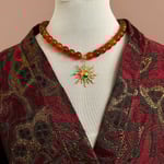 Mooie karamel-kleurige parels met centraal vooraan een XL zonnebedel in goudkleurige afwerking ; karabijnslotje achteraan. Lengte is ongeveer 45 cm (naargelang de halsbreedte, check lengte indicatie afbeelding voor de duidelijkheid) Wenst u een verlengstukje ? Klik de juiste optie aan.