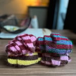 De sjaaltjes worden handgebreid en wekelijks vullen we met nieuwe kleurcombinaties aan, zolang de wolletjes voorraad strekt. U kan ze ook live komen passen tijdens de pop-up momenten van november/december, in respectievelijk Puurs, Brussel & Grobbendonk.